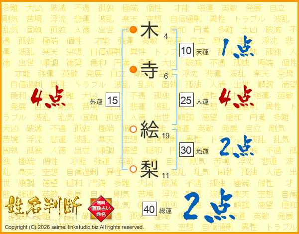 生活面を象徴する運勢です。外部から受ける影響力を表し、結婚運、家庭運や職場、環境への順応性を表します。総運から人運を引いた画数。姓や名が1文字の場合を除く。