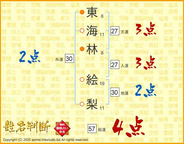 東(8画)海(11画)林(8画) 絵(19画)梨(11画)