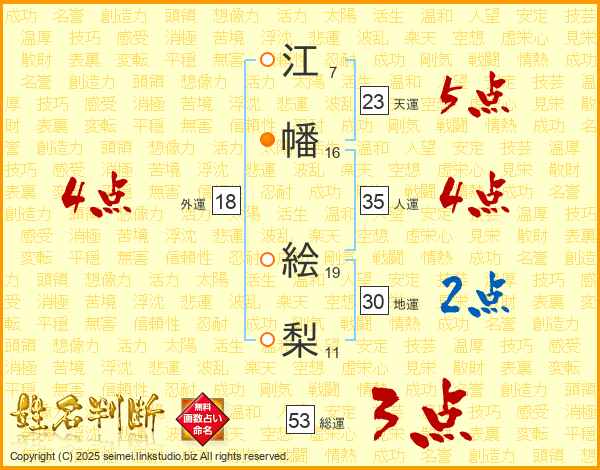 江(7画)幡(16画) 絵(19画)梨(11画)