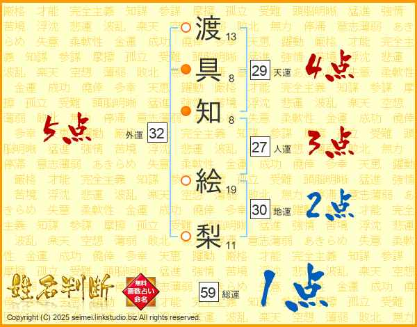 渡(13画)具(8画)知(8画) 絵(19画)梨(11画)