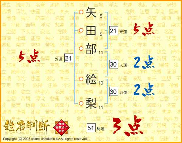 矢田部絵梨さんの天運は21画の5点!