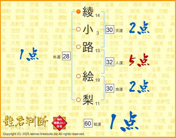 綾(14画)小(3画)路(13画) 絵(19画)梨(11画)