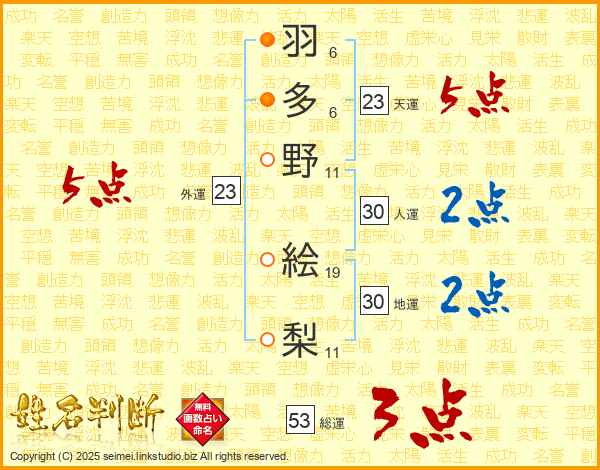 羽(6画)多(6画)野(11画) 絵(19画)梨(11画)