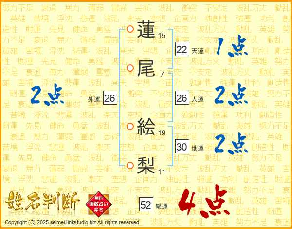 蓮(15画)尾(7画) 絵(19画)梨(11画)