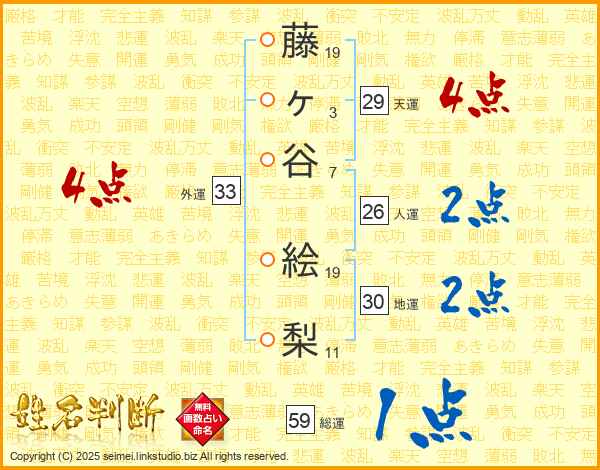 藤(19画)ヶ(3画)谷(7画) 絵(19画)梨(11画)