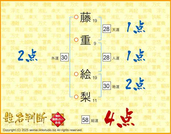 藤(19画)重(9画) 絵(19画)梨(11画)