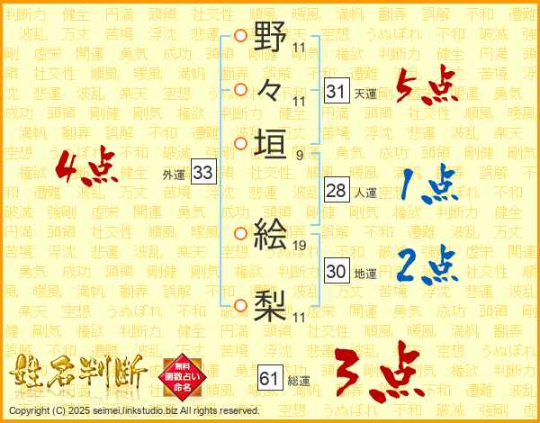 野(11画)々(11画)垣(9画) 絵(19画)梨(11画)
