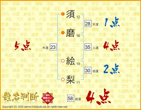 須(12画)磨(16画) 絵(19画)梨(11画)