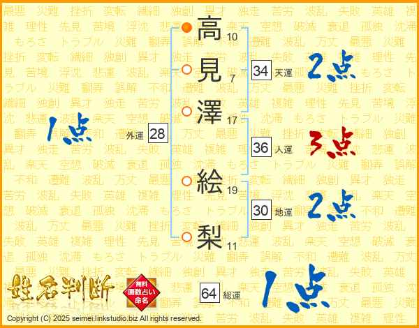 高(10画)見(7画)澤(17画) 絵(19画)梨(11画)