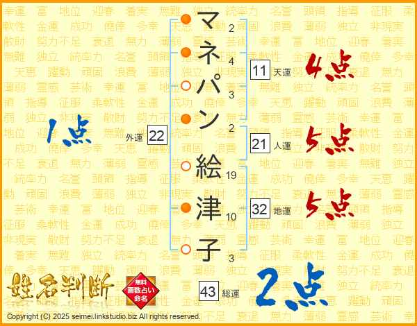生活面を象徴する運勢です。外部から受ける影響力を表し、結婚運、家庭運や職場、環境への順応性を表します。総運から人運を引いた画数。姓や名が1文字の場合を除く。