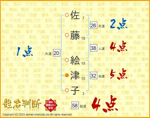 佐(7画)藤(19画) 絵(19画)津(10画)子(3画)