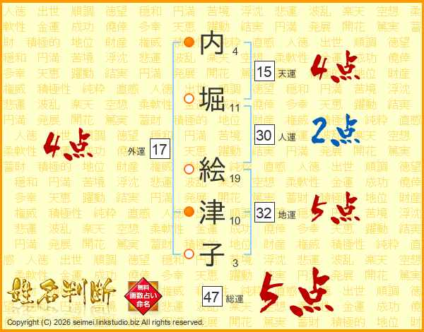 内(4画)堀(11画) 絵(19画)津(10画)子(3画)