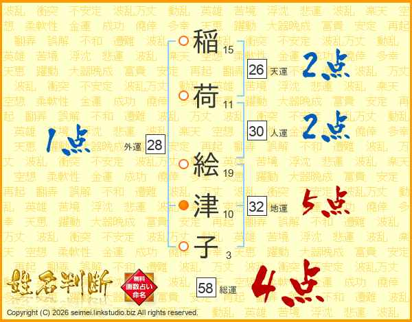 稲(15画)荷(11画) 絵(19画)津(10画)子(3画)