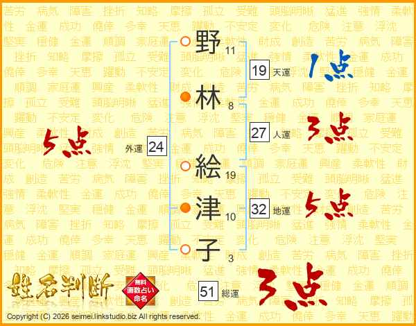 野(11画)林(8画) 絵(19画)津(10画)子(3画)