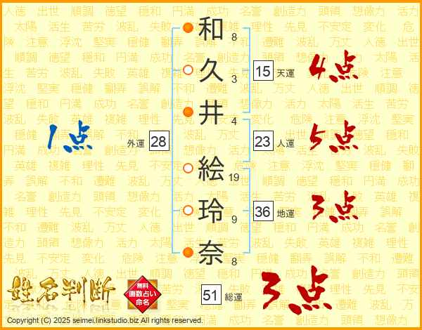 和(8画)久(3画)井(4画) 絵(19画)玲(9画)奈(8画)