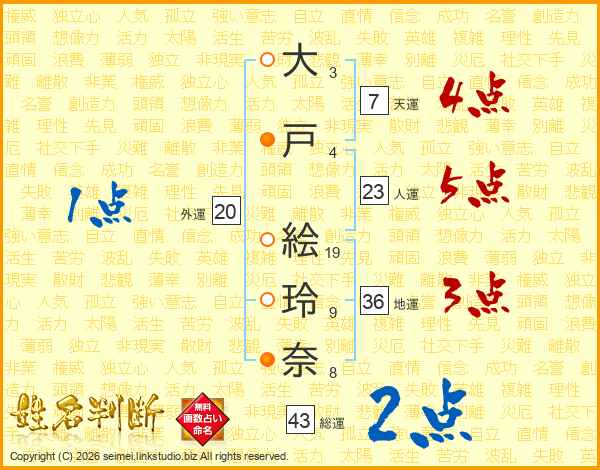 大(3画)戸(4画) 絵(19画)玲(9画)奈(8画)