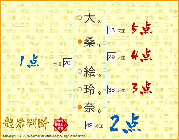 大(3画)桑(10画) 絵(19画)玲(9画)奈(8画)