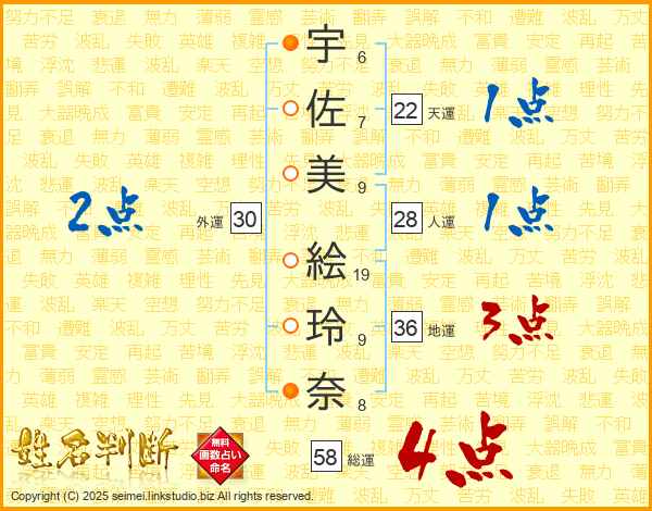 宇(6画)佐(7画)美(9画) 絵(19画)玲(9画)奈(8画)