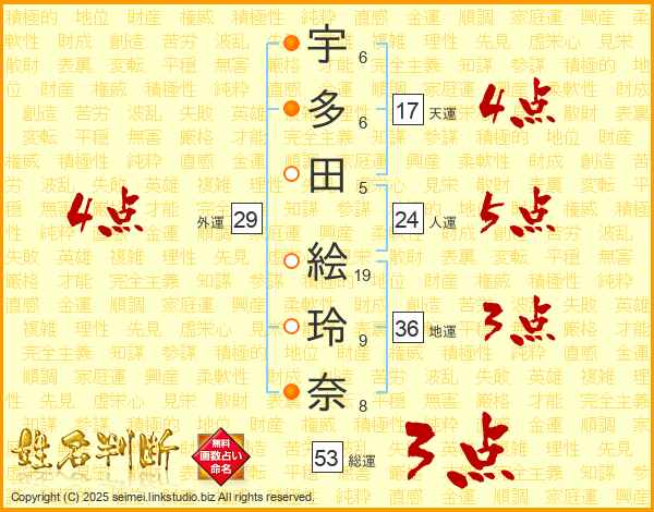 宇(6画)多(6画)田(5画) 絵(19画)玲(9画)奈(8画)