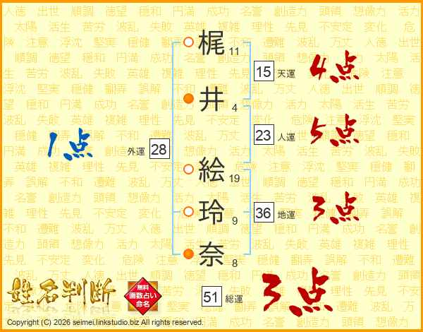 梶(11画)井(4画) 絵(19画)玲(9画)奈(8画)