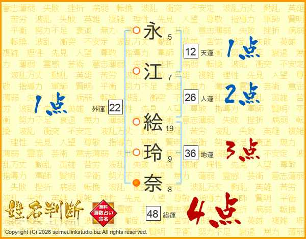 永(5画)江(7画) 絵(19画)玲(9画)奈(8画)