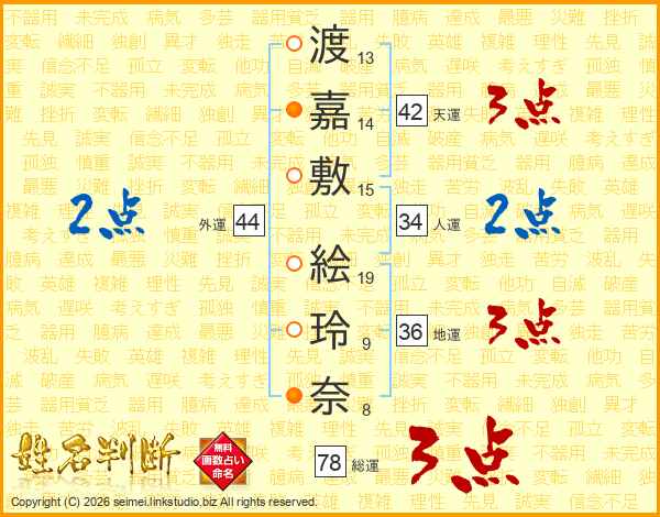 渡(13画)嘉(14画)敷(15画) 絵(19画)玲(9画)奈(8画)