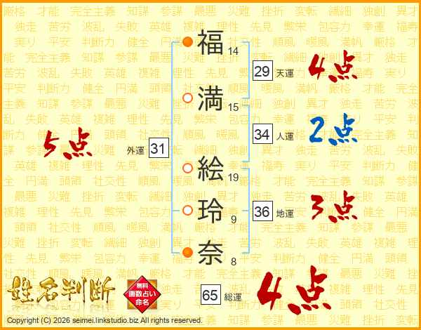福(14画)満(15画) 絵(19画)玲(9画)奈(8画)