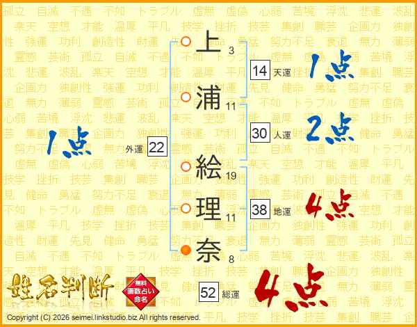 上(3画)浦(11画) 絵(19画)理(11画)奈(8画)