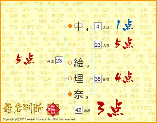 中(4画) 絵(19画)理(11画)奈(8画)
