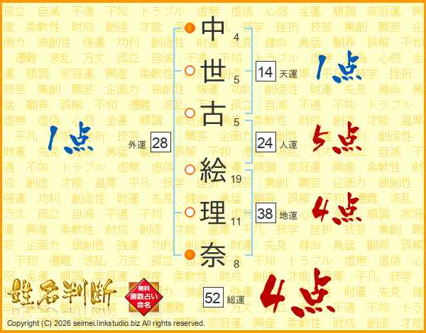 中(4画)世(5画)古(5画) 絵(19画)理(11画)奈(8画)