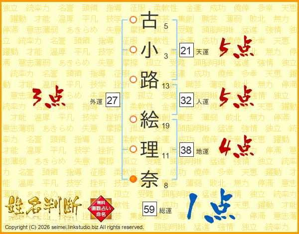 古(5画)小(3画)路(13画) 絵(19画)理(11画)奈(8画)