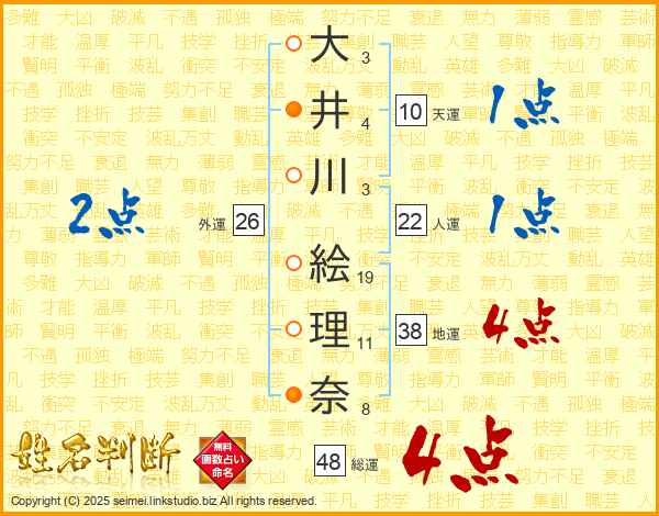 大(3画)井(4画)川(3画) 絵(19画)理(11画)奈(8画)