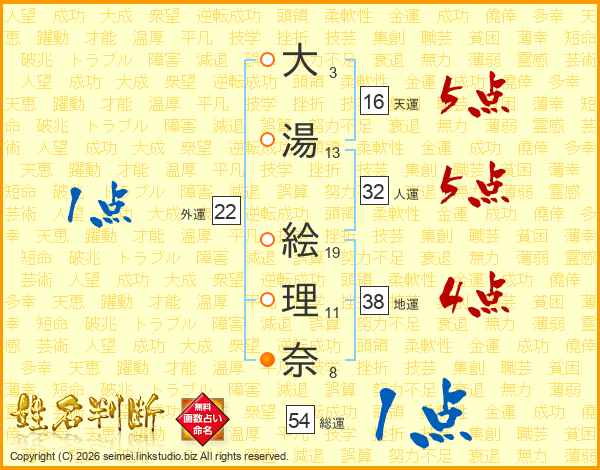 大(3画)湯(13画) 絵(19画)理(11画)奈(8画)