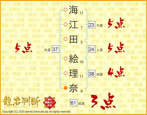 海(11画)江(7画)田(5画) 絵(19画)理(11画)奈(8画)