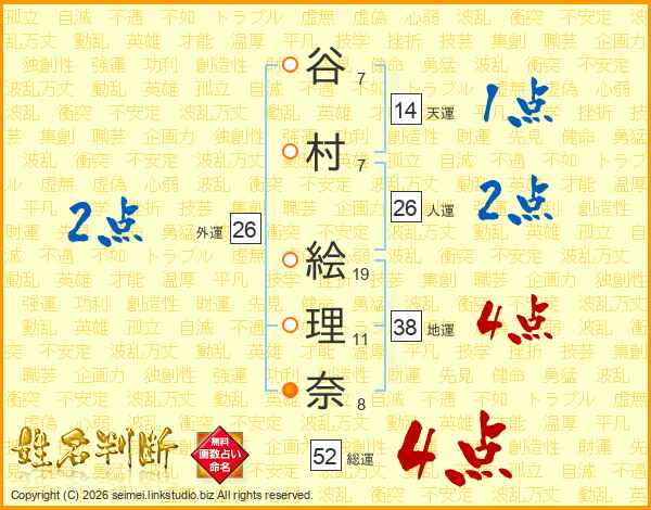谷(7画)村(7画) 絵(19画)理(11画)奈(8画)