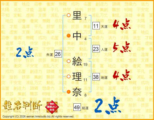 里(7画)中(4画) 絵(19画)理(11画)奈(8画)