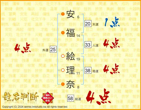 安(6画)福(14画) 絵(19画)理(11画)奈(8画)