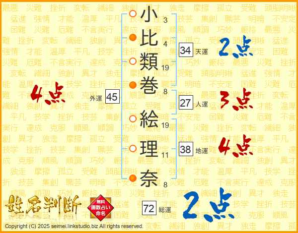 小(3画)比(4画)類(19画)巻(8画) 絵(19画)理(11画)奈(8画)