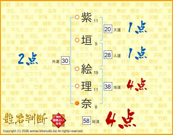 紫垣絵理奈さんの総運は58画の4点!