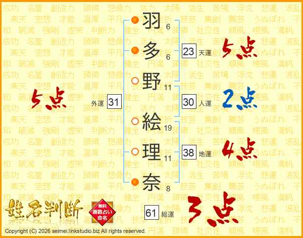 羽(6画)多(6画)野(11画) 絵(19画)理(11画)奈(8画)
