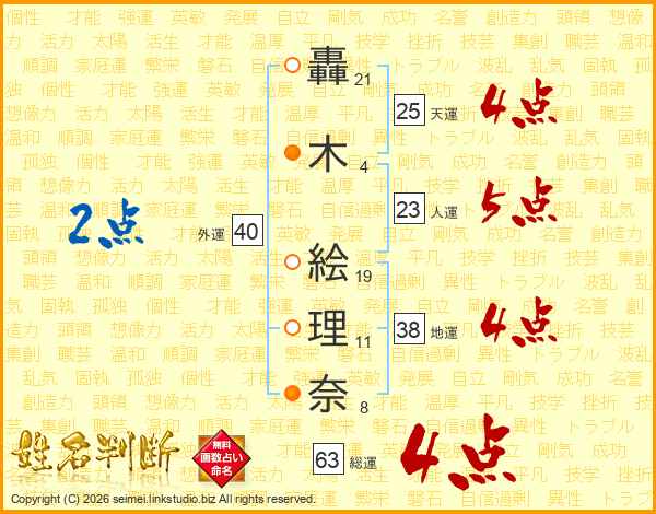 轟(21画)木(4画) 絵(19画)理(11画)奈(8画)