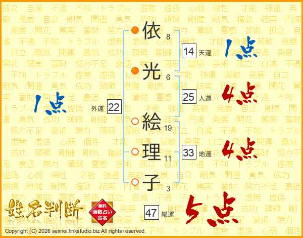 依(8画)光(6画) 絵(19画)理(11画)子(3画)