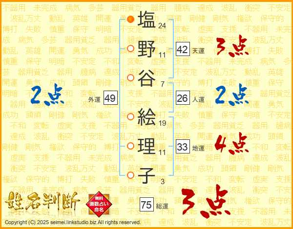 塩(24画)野(11画)谷(7画) 絵(19画)理(11画)子(3画)