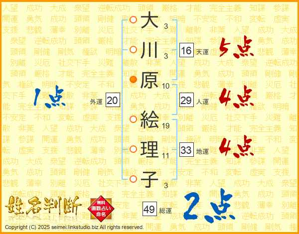 大(3画)川(3画)原(10画) 絵(19画)理(11画)子(3画)