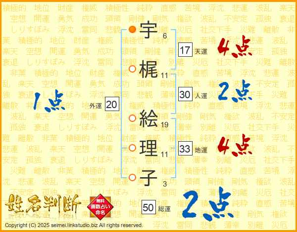 宇(6画)梶(11画) 絵(19画)理(11画)子(3画)