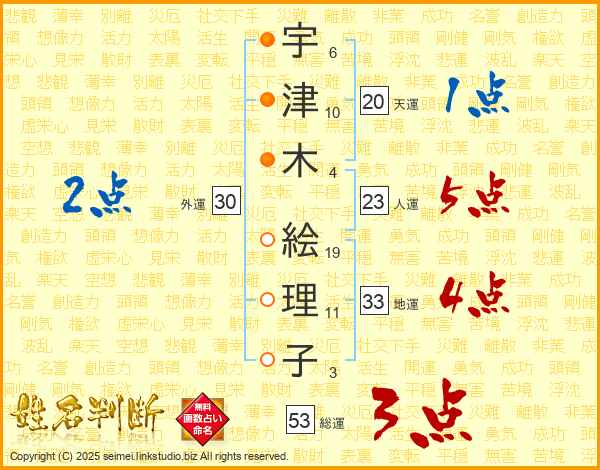 宇(6画)津(10画)木(4画) 絵(19画)理(11画)子(3画)