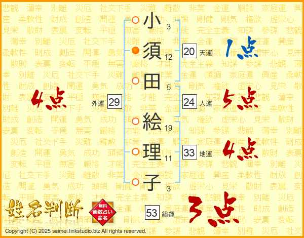 小(3画)須(12画)田(5画) 絵(19画)理(11画)子(3画)