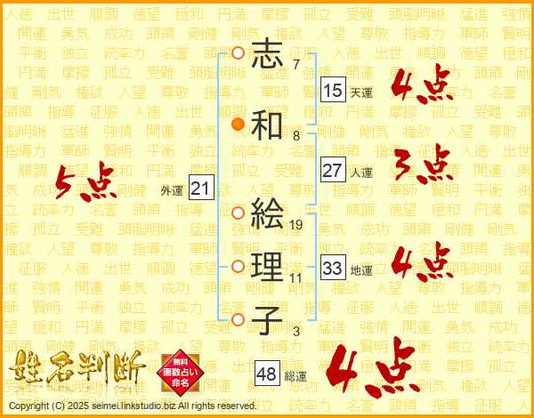 志(7画)和(8画) 絵(19画)理(11画)子(3画)