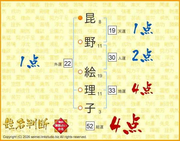 昆(8画)野(11画) 絵(19画)理(11画)子(3画)