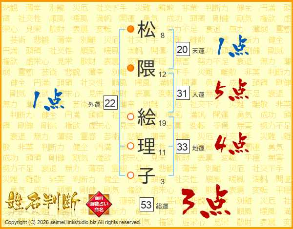 松(8画)隈(12画) 絵(19画)理(11画)子(3画)